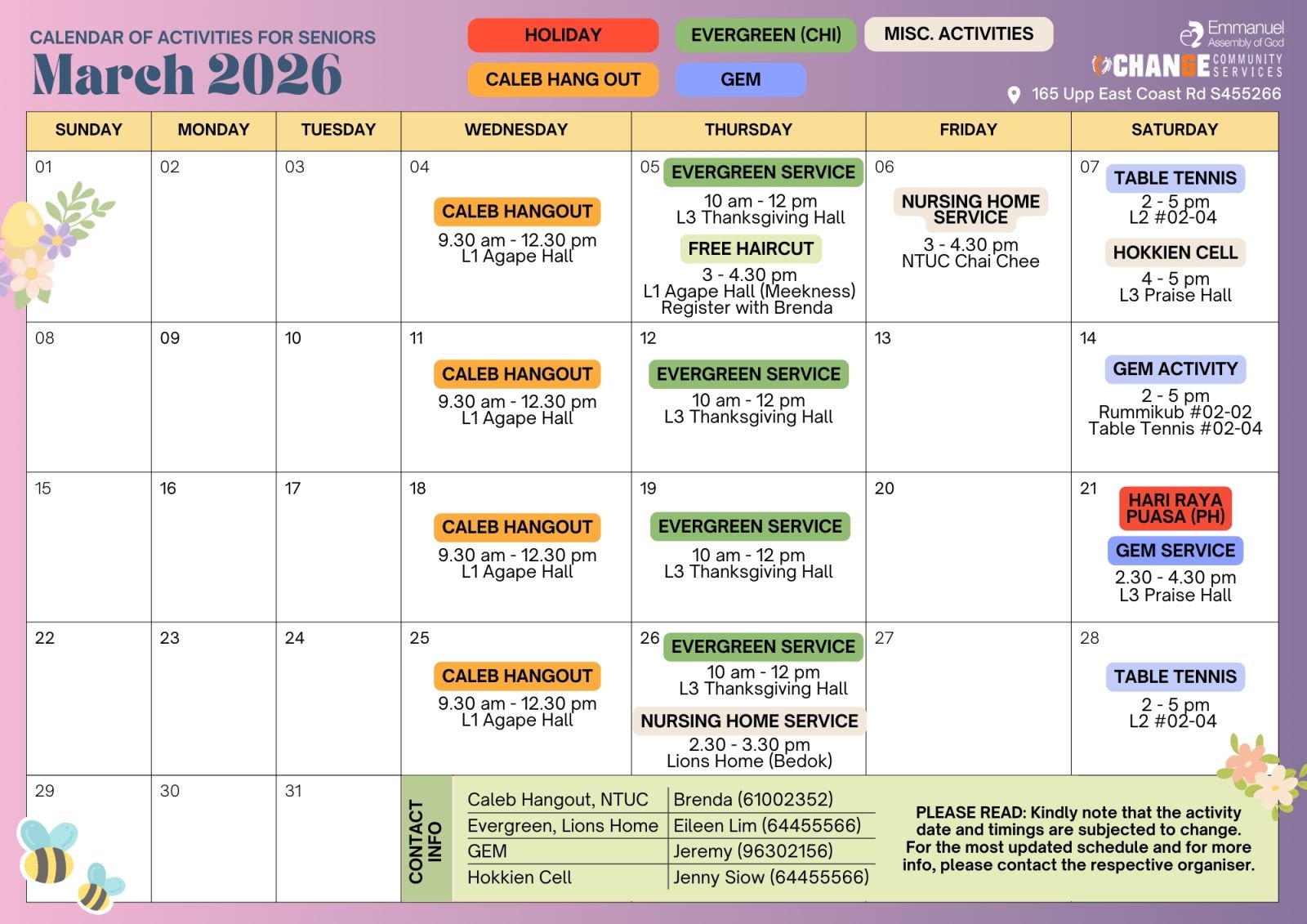 We seek to empower our seniors whom we lovingly call Calebs (50 and above) to live a purposeful life through active lifestyle, enrichment and engagement with the community.
